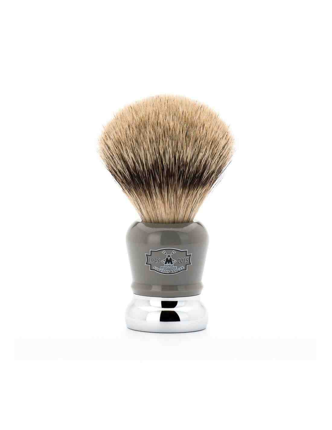 Il ciufffo del Pennello da barba 70° Anniversario Muhle è costituito da peli di tasso silver spitz, l'impugnatura è in resina grigia, le parti metalliche sono cromate.
