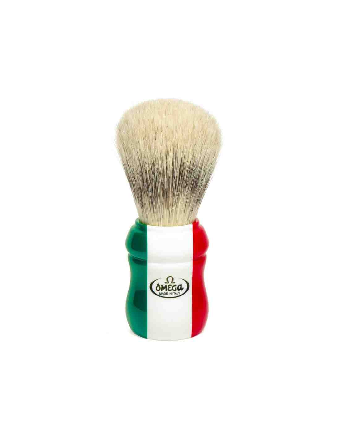 Il pennello da barba Omega gigante 1006 è un Pennello da Esposizione in pura setola extra lunga effetto tasso con manico in resina e i colori della Bandiera Italiana.